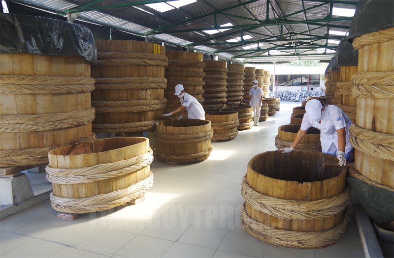 Cá được ủ chượp trong thùng gỗ bảo đảm vệ sinh, an toàn thực phẩm.(Thanhuytphcm.vn) - Thực hiện nhiệm vụ quốc phòng kết hợp phát triển kinh tế biển, nhiều năm qua Xí nghiệp Tàu đánh cá công ích (Hải đội 433) thuộc Hải đoàn 128 (Công ty TNHH Một thành viên 128), Tổng Công ty Tân cảng Sài Gòn không chỉ tham gia bảo vệ vững chắc chủ quyển biển đảo, thềm lục địa thiêng liêng của Tổ quốc, làm điểm tựa cho ngư dân vươn khơi, đánh bắt xa bờ, mà còn kết hợp khai thác hải sản, sản xuất và phát triển nước mắm truyền thống, đó là nước mắm Hải quân - Một thương hiệu của người lính biển, sạch, an toàn, chất lượng.