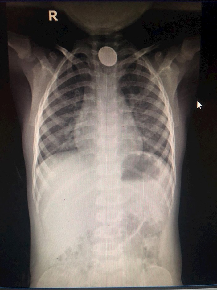 Theo đó, tối 6/1, anh H. nghe con than mệt, đau ở cổ họng, ăn vào nôn ói và ho sặc sụa nên gia đình lập tức đưa bé đến Phòng khám Nhi của Bệnh viện quận Thủ Đức. Qua kiểm tra lâm sàng, nghi ngờ bé T. nuốt phải dị vật, bác sĩ nhanh chóng cho bé chụp X-Quang. Hình ảnh chụp cho thấy chỗ 1/3 thực quản trên của bé có dị vật kim loại hình tròn. Bé được đưa vào phòng mổ để gây mê, nội soi gắp dị vật khẩn.