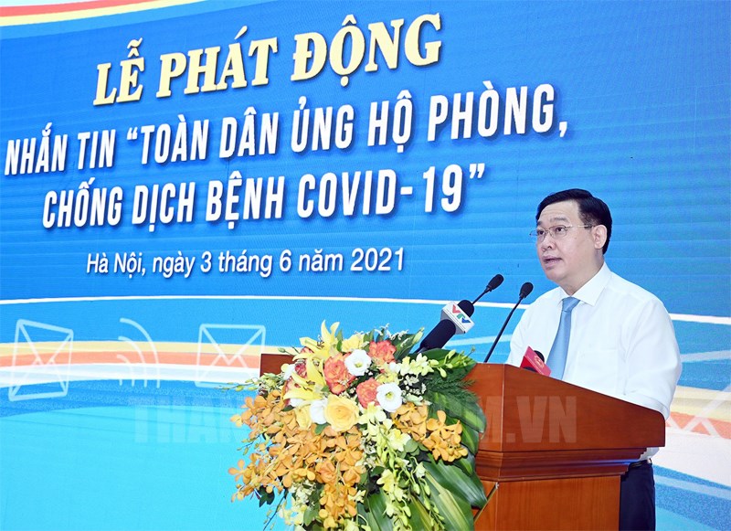 Các đại biểu nhắn tin ủng hộ phòng, chống dịch Covid-19.Phát biểu tại lễ phát động, Chủ tịch Quốc hội Vương Đình Huệ nêu rõ, Đảng, Nhà nước, các cấp ủy, chính quyền địa phương đã chỉ đạo, huy động cả hệ thống chính trị và người dân vào cuộc với các giải pháp đồng bộ, quyết liệt khoanh vùng, cách ly, truy vết, dập dịch. Đến nay, bước đầu chúng ta đã kiểm soát được tình hình, cơ bản phấn đấu thực hiện được mục tiêu vừa phòng, chống dịch bệnh, bảo vệ sức khoẻ nhân dân, vừa phục hồi và phát triển kinh tế, xã hội. Cùng với việc thực hiện nghiêm ngặt các biện pháp phòng, chống dịch, đặc biệt là nguyên tắc 5K thì việc thực hiện Chiến lược Vaccine ngừa Covid-19 nhằm sớm tạo được miễn dịch trong cộng đồng có ý nghĩa căn cơ, lâu dài, mang tính chiến lược, quyết định. Do đó, Bộ Chính trị, Ban Bí thư đã họp bàn và quyết định huy động các nguồn lực của ngân sách Nhà nước và các nguồn lực xã hội để mua vaccine phòng Covid-19 cho toàn dân.