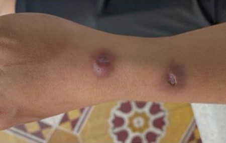 Nhiều nốt/cục màu đỏ tím dọc cánh tay bệnh nhân.(Thanhuytphcm.vn) – Ngày 12/11, Bệnh viện Da liễu TPHCM cho biết, Bệnh viện vừa tiếp nhận một bệnh nhân nam, ngụ tỉnh Tây Ninh, đến khám vì dọc cánh tay trái xuất hiện nhiều nốt màu đỏ tím, không đau.