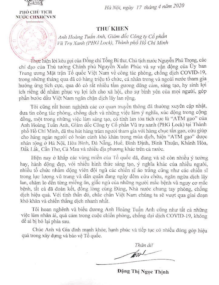 Thư khen của Phó Chủ tịch nước Đặng Thị Ngọc Thịnh.(Thanhuytphcm.vn) - Chiều 17/4, Phó Chủ tịch nước Đặng Thị Ngọc Thịnh đã gửi Thư khen, biểu dương anh Hoàng Tuấn Anh, Giám đốc Công ty Cổ phần Vũ trụ xanh (PHG Lock) ngụ tại TPHCM, vì đã có việc làm sáng tạo, có tính lan tỏa tích cực khi sáng chế “ATM gạo”, hỗ trợ những hoàn cảnh khó khăn trước đại dịch COVID-19.