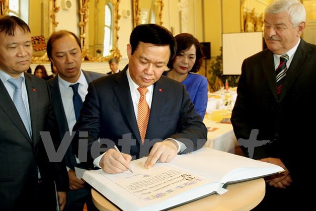 Phó Thủ tướng Vương Đình Huệ lưu bút tại trụ sở chính quyền Trnava. (Ảnh: Vietnam+)