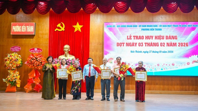 Các đảng viên vinh dự đón nhận Huy hiệu Đảng tại buổi lễSáng 27/1, Đảng ủy phường Bến Thành tổ chức Họp mặt kỷ niệm 96 năm Ngày thành lập Đảng Cộng sản Việt Nam và Lễ trao tặng Huy hiệu Đảng.
