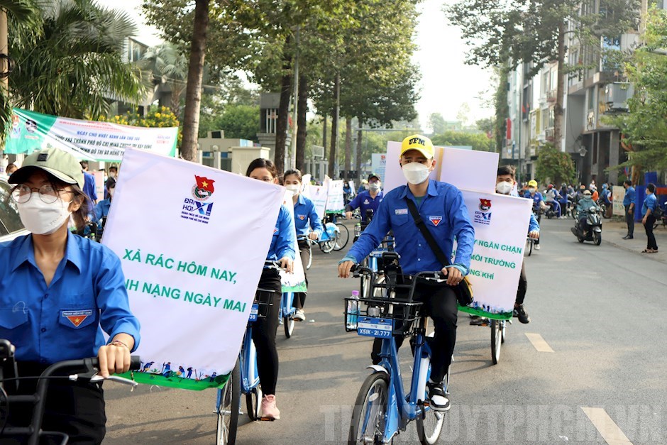 Đạp xe tuyên truyền bảo vệ môi trường(Thanhuytphcm.vn) - Sáng 20/3, Thành đoàn TPHCM phối hợp UBND Quận 1 tổ chức lễ ra quân Ngày Chủ nhật xanh lần thứ 144. Tham dự lễ ra quân có các đồng chí: Trần Kim Yến, Ủy viên Ban Thường vụ Thành ủy, Bí thư Quận ủy Quận 1; Ngô Minh Hải, Phó Bí thư Thường trực Thành đoàn; đại diện lãnh đạo ban, ngành, đoàn thể Quận 1 cùng hơn 300 đoàn viên, thanh niên các cơ sở đoàn trên địa bàn.