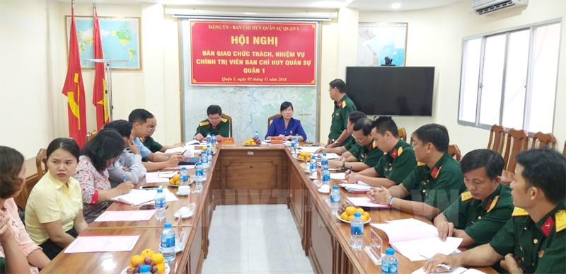 (Thanhuytphcm.vn) - Chiều ngày 2/11, Đảng ủy - Ban Chỉ huy Quân sự (CHQS) Quận 1 đã tổ chức bàn giao chức trách, nhiệm vụ Chính trị viên Ban CHQS quận. Dự buổi bàn giao có Đại tá Phan Văn Xựng, Phó Chính ủy Bộ Tư Lệnh Thành phố; đồng chí Hoàng Thị Tố Nga, Phó Bí thư Thường trực Quận ủy Quận 1 (ảnh).