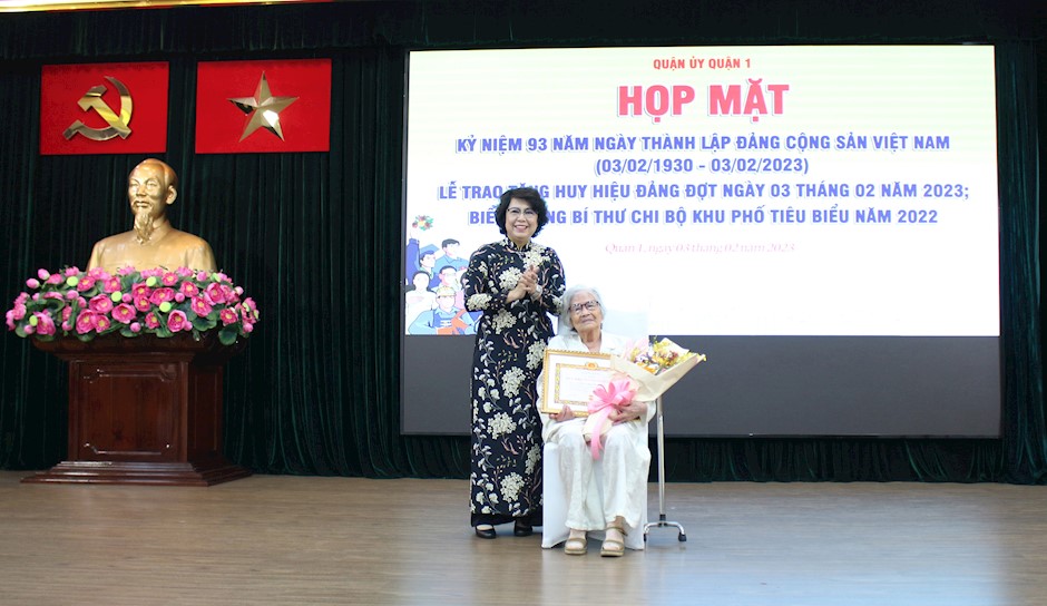 Đồng chí Tô Thị Bích Châu trao huy hiệu 75 năm tuổi Đảng đến đảng viên Vương Thị Hồng Điệp, Đảng bộ phường Phạm Ngũ Lão(Thanhuytphcm.vn) - Sáng 3/2, Quận ủy Quận 1 tổ chức họp mặt kỷ niệm 93 năm ngày thành lập Đảng Cộng sản Việt Nam (3/2/1930 - 3/2/2023); trao tặng Huy hiệu Đảng đợt ngày 3/2/2023 và biểu dương bí thư chi bộ khu phố tiêu biểu năm 2022. Tham dự có các đồng chí: Tô Thị Bích Châu, Ủy viên Ban Thường vụ Thành ủy, Bí thư Quận ủy Quận 1; Hoàng Thị Tố Nga, Phó Bí thư thường trực Quận ủy Quận 1 ; Lê Đức Thanh, Chủ tịch UBND Quận 1; Dương Thị Hồng Gấm, Chủ tịch Ủy ban MTTQ Việt Nam Quận 1.