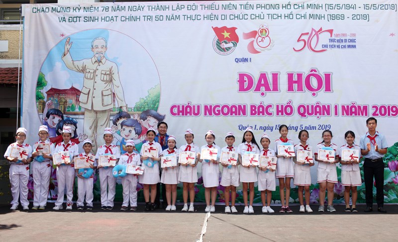 Tuyên dương, khen thưởng Đội viên tiêu biểu đạt danh hiệu Cháu ngoan Bác Hồ năm 2019.(Thanhuytphcm.vn) - Sáng 15/5, tại Trường THCS Trần Văn Ơn, gần 300 học sinh tiêu biểu đến từ các trường tiểu học, trung học cơ sở trên địa bàn quận tham dự đại hội cháu ngoan Bác Hồ năm 2019 do Quận đoàn - Hội đồng Đội Quận 1 tổ chức nhân kỷ niệm 78 năm Ngày thành lập Đội Thiếu niên Tiền phong Hồ Chí Minh (15/5/1941 - 15/5/2019). Tham dự có các đồng chí Nguyễn Kim Đức, Trưởng Ban Dân vận Quận ủy Quận 1; Lưu Trung Hòa, Phó Chủ tịch UBND Quận 1.