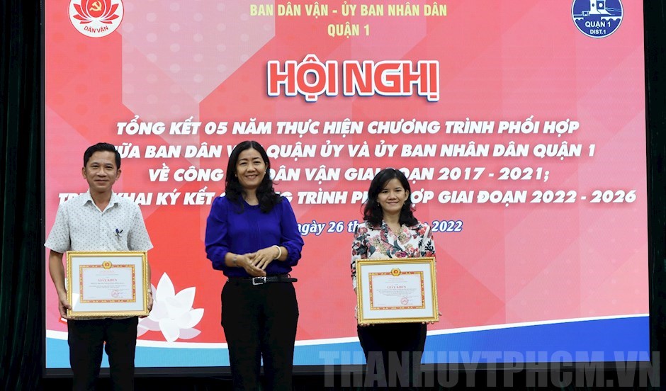 Trao Giấy khen của Ban Dân vận Thành ủy TPHCM cho các tập thể đã có mô hình, cách làm hay trong công tác phòng chống dịch Covid-19(Thanhuytphcm.vn) - Ngày 26/5, Ban Dân vận Quận ủy, UBND Quận 1 tổ chức Hội nghị tổng kết 5 năm thực hiện Chương trình phối hợp số 02-Ctr/BDVQU-UBNDQ1 giữa Ban Dân vận Quận ủy và UBND Quận 1 về công tác dân vận giai đoạn 2017-2021; triển khai ký kết Chương trình phối hợp giai đoạn 2022-2026.