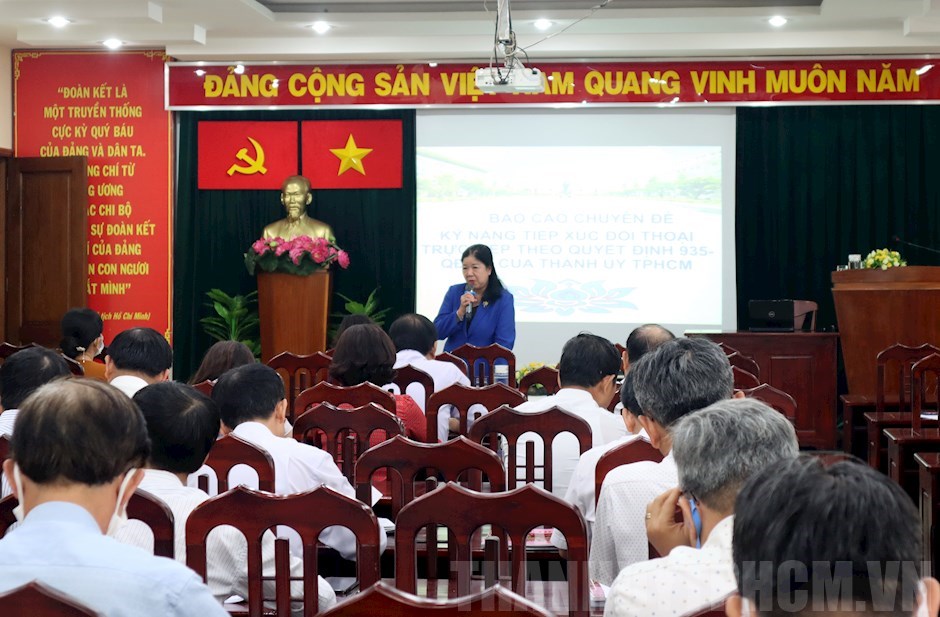Báo cáo viên, Thạc sĩ Nguyễn Thị Bích Ngọc, nguyên Phó Trưởng Ban Dân vận Thành ủy TPHCM đã triển khai những nội dung cơ bản của Quyết định 935-QĐ/TU 28/4/2017 của Thành ủy TPHCM ban hành Quy chế về tiếp xúc, đối thoại trực tiếp giữa người đứng đầu cấp ủy, người đứng đầu chính quyền các cấp với nhân dân trên địa bàn; Quyết định 936-QĐ/TU ngày 28/4/2017 của Thành ủy TPHCM ban hành Quy định về trách nhiệm của cấp ủy, tổ chức đảng, chính quyền, cán bộ, đảng viên, công chức, viên chức tiếp thu góp ý của Mặt trận Tổ quốc, các tổ chức chính trị - xã hội và nhân dân tham gia góp ý xây dựng đảng, xây dựng chính quyền trên địa bàn.