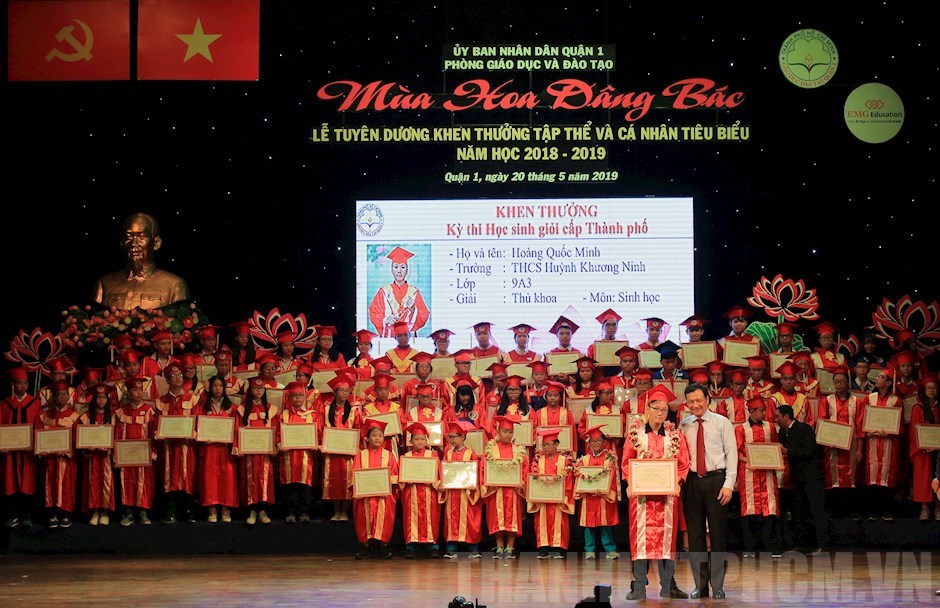 Phó Giám đốc và Đào tạo TPHCM Lê Hoài Nam trao khen thưởng các học sinh giỏi Quận 1(Thanhuytphcm.vn) - Chiều 20/5, Phòng Giáo dục và Đào tạo Quận 1 tổ chức chương trình “Mùa hoa dâng Bác” nhân kỷ niệm 129 năm Ngày sinh Chủ tịch Hồ Chí Minh. Đến dự có các đồng chí: Lê Hoài Nam, Phó Giám đốc Sở Giáo dục và Đào tạo TPHCM; Hoàng Thị Tố Nga, Phó Bí thư Thường trực Quận ủy Quận ủy Quận 1; Nguyễn Văn Dũng, Phó Bí thư, Chủ tịch UBND quận; Phan Trọng Quyền, Phó Chủ tịch HĐND quận; Dương Thị Hồng Gấm, Chủ tịch Ủy ban MTTQ Việt Nam quận.
