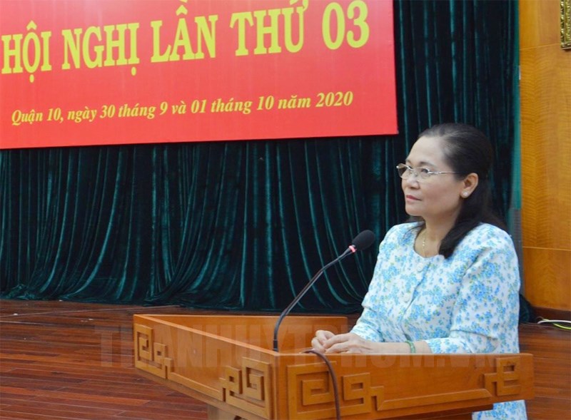 Chủ tịch HĐND TP Nguyễn Thị Lệ phát biểu tại hội nghị.(Thanhuytphcm.vn) - Trong 2 ngày 30/9 và 1/10, Quận ủy Quận 10 tổ chức hội nghị lần thứ 3 Ban Chấp hành Đảng bộ Quận 10 khóa XII, nhiệm kỳ 2020-2025. Đến dự có Phó Bí thư Thành ủy, Chủ tịch HĐND TP Nguyễn Thị Lệ. Bí thư Quận ủy Đặng Quốc Toàn chủ trì hội nghị.