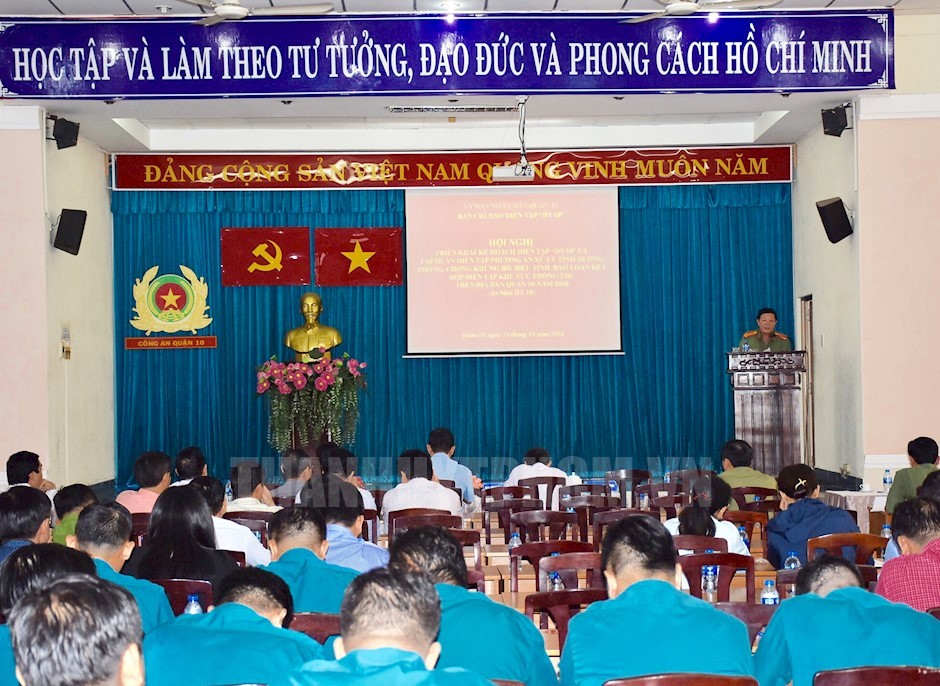 Toàn cảnh hội nghị triển khai kế hoạch diễn tập phòng, chống khủng bố, biểu tình, bạo loạn kết hợp diễn tập khu vực phòng thủ Quận 10 năm 2018(Thanhuytphcm.vn) - Ngày 24/10, UBND Quận 10 tổ chức hội nghị triển khai kế hoạch diễn tập phòng, chống khủng bố, biểu tình, bạo loạn kết hợp diễn tập khu vực phòng thủ Quận 10 năm 2018 (Diễn tập DT -18).