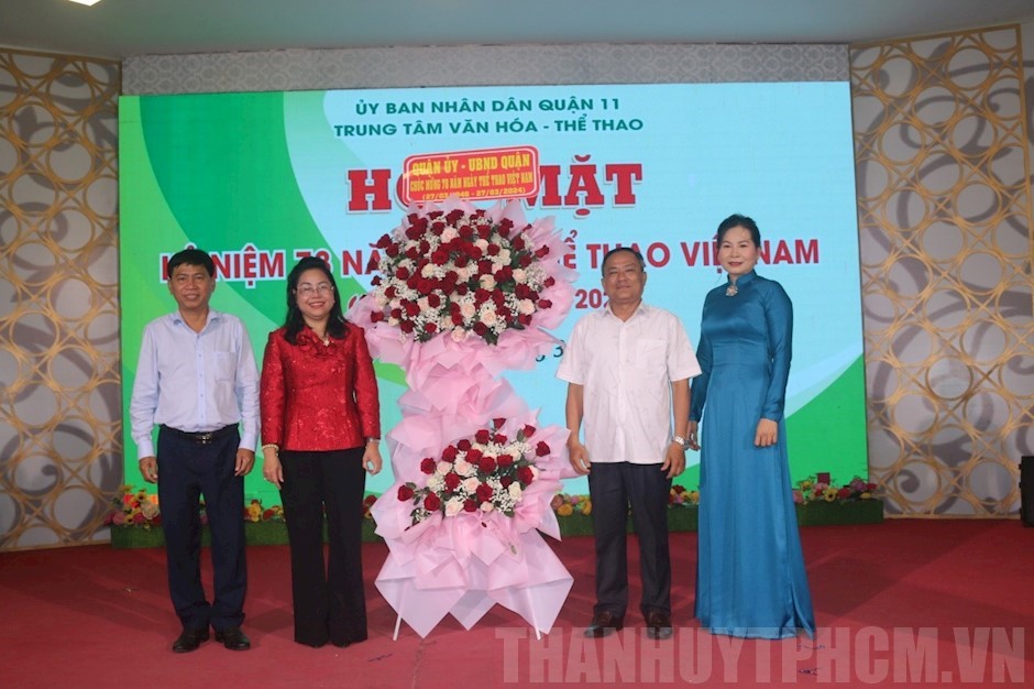 Lãnh đạo Quận ủy, UBND Quận tặng hoa chúc mừng Trung tâm Văn hóa - Thể thao trong buổi họp mặt(Thanhuytphcm.vn) - Chiều 27/3, Trung tâm Văn hóa - Thể thao Quận 11 tổ chức họp mặt kỷ niệm 78 năm Ngày truyền thống ngành Thể dục thể thao Việt Nam, ngày Bác Hồ viết bài “Thể dục và sức khỏe” kêu gọi toàn dân tập thể dục (27/3/1946 - 27/3/2024).
