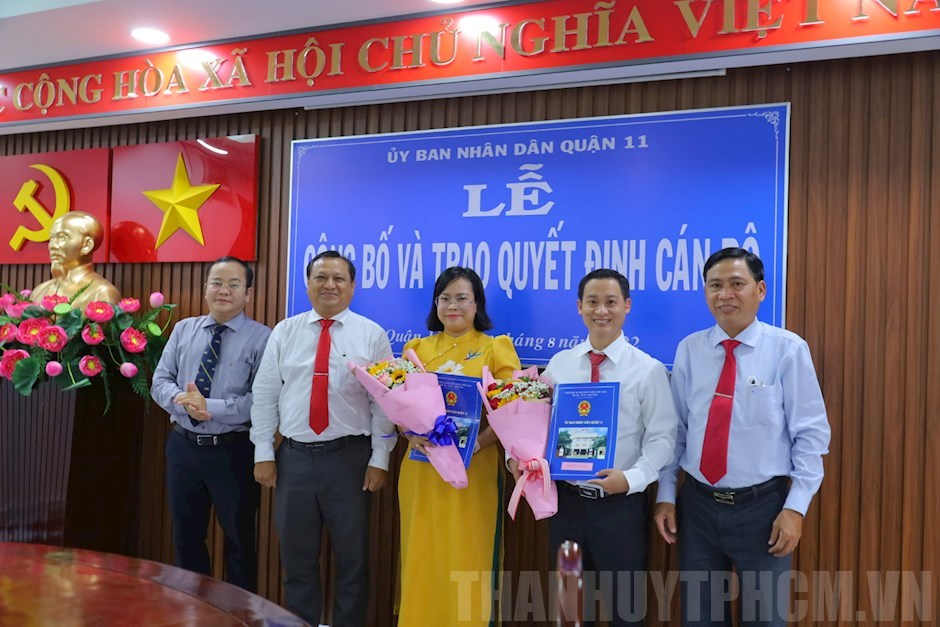 Các đồng chí lãnh đạo trao quyết định và tặng hoa chúc mừng đồng chí Phạm Trần Tuấn Khải và đồng chí Nguyễn Thị Mai Khanh(Thanhuytpchm.vn) – Chiều 31/8, UBND Quận 11 tổ chức lễ công bố và trao quyết định cán bộ. Tham dự có các đồng chí: Trần Phi Long, Phó Bí thư Quận ủy, Chủ tịch UBND Quận 11; Huỳnh Kim Tuấn, Trưởng ban Tổ chức Quận ủy; Trần Thúc Chương, Phó Chủ tịch UBND quận.