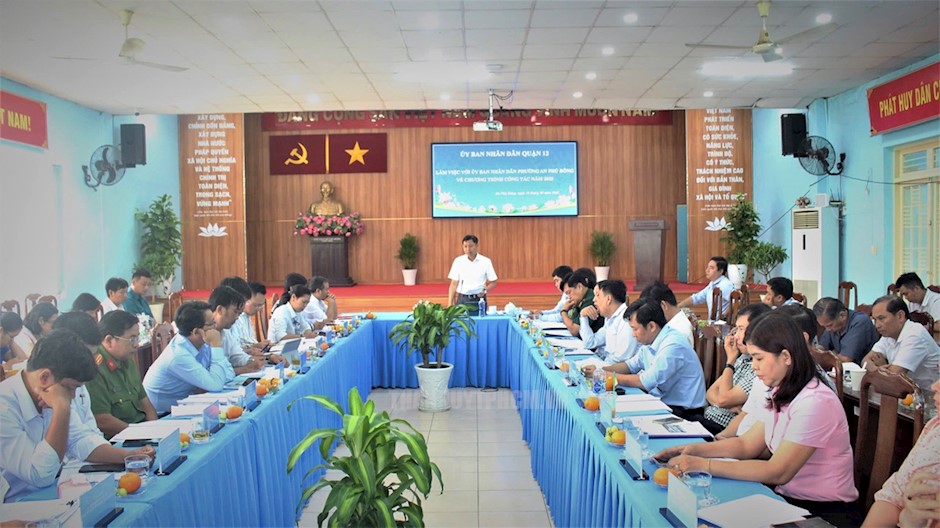 Phó Bí thư Quận ủy, Chủ tịch UBND Quận 12 Nguyễn Văn Đức phát biểu chỉ đạo tại buổi làm việc(Thanhuytphcm.vn) - Sáng 19/2, Thường trực UBND Quận 12 do đồng chí Nguyễn Văn Đức, Phó Bí thư Quận ủy, Chủ tịch UBND Quận 12 chủ trì làm việc với phường An Phú Đông về chương trình phát triển kinh tế - xã hội năm 2025 của phường. Cùng dự có Thủ trưởng các phòng, ban ngành quận, Công an quận, Ban Chỉ huy Quân sự Quận 12.