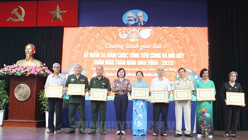 Lãnh đạo UBND quận trao khen thưởng cho các tập thể tại chương trình(Thanhuytphcm.vn) - Sáng 18/2, Câu lạc bộ Truyền thống kháng chiến quận phối hợp với Hội Liên hiệp phụ nữ quận và Quận đoàn 12 tổ chức chương trình giao lưu kỷ niệm 55 năm cuộc tổng tiến công và nổi dậy Xuân Mậu Thân 1968. Đến dự có các đồng chí: Nguyễn Văn Năm, Ủy viên Ban Thường vụ Quận ủy, Trưởng Ban Dân vận Quận ủy; Võ Thị Chính, Quận ủy viên, Phó Chủ tịch UBND quận.