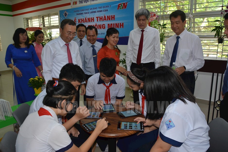 Bí thư Quận ủy Quận 2 Nguyễn Hoài Nam (bìa phải) tham quan “ Thư viện thông minh F&N” tại trường THCS Lương Định Của Quận 2(Thanhuytphcm.vn) - Sáng 5/9, Phòng Giáo dục và Đào tạo Quận 2 tổ chức lễ khánh thành “Thư viện thông minh F&N” đặt tại Trường THCS Lương Định Của. Đến tham dự có Bí thư Quận ủy Quận 2 Nguyễn Hoài Nam.