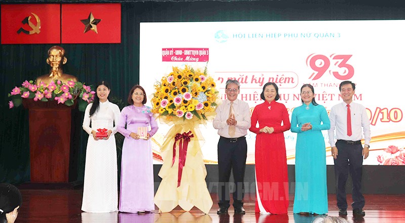 Lãnh đạo Quận ủy, Ủy ban Nhân dân, Ủy ban MTTQ Quận 3 tặng hoa chúc mừng(Thanhuytphcm.vn) - Sáng 18/10, Hội Liên hiệp Phụ nữ Quận 3 tổ chức họp mặt kỷ niệm 93 năm Ngày thành lập Hội Liên hiệp phụ nữ Việt Nam và 13 năm Ngày Phụ nữ Việt Nam 20/10. Đến dự có các đồng chí: Nguyễn Trần Phượng Trân, Thành ủy viên, Chủ tịch Hội Liên hiệp Phụ nữ TPHCM; Nguyễn Thị Thanh Loan, Trưởng Ban Chính sách - Luật pháp Hội LHPN TPHCM; Nguyễn Thành Nam, Phó Bí thư Thường trực Quận ủy; Nguyễn Đình Phát, Ủy viên Ban Thường vụ, Trưởng Ban Tổ chức Quận ủy; Trần Thị Hường, Ủy viên Ban Thường vụ, Trưởng Ban Dân vận Quận ủy; Vũ Tố Quyên, Ủy viên Ban Thường vụ, Trưởng Ban Tuyên giáo Quận ủy; Vũ Thị Mỹ Ngọc, Ủy viên Ban Thường vụ, Phó Chủ tịch UBND quận; Đoàn Thị Cẩm Tú, Chủ tịch Hội LHPN Quận 3…