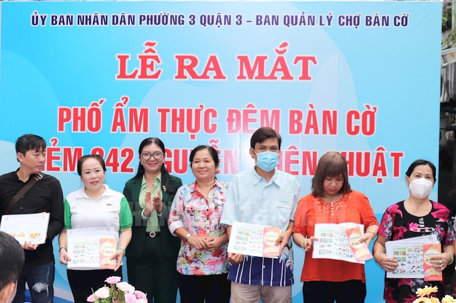 Phó Chủ tịch UBND Quận 3 Phạm Thị Thuý Hằng trao thư cảm ơn và thiết bị vệ sinh môi trường cho hộ kinh doanh và tiểu thương tham gia buôn bán trên phố ẩm thực. Ảnh: Công Danh(Thanhuytphcm.vn) - Tối 31/8, UBND Phường 3, Quận 3 phối hợp với Ban Quản lý chợ Bàn Cờ tổ chức lễ ra mắt Phố ẩm thực Bàn Cờ. Tham dự có đồng chí: Phạm Thị Thúy Hằng, Phó Chủ tịch UBND Quận 3; Trần Nguyên Phong, Phó Trưởng Ban Dân vận Quận ủy; Huỳnh Thị Bạch Yến, Bí thư Đảng ủy Phường 3...