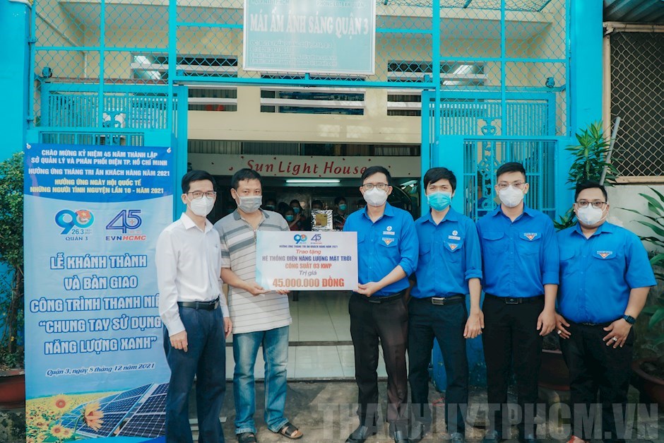 Trao tặng hệ thống điện năng lượng mặt trời với công suất 03 KPW cho đại diện mái ấm Ánh Sáng(Thanhuytphcm.vn) - Hưởng ứng Ngày hội Quốc tế những người tình nguyện lần thứ 10 – Năm 2021, sáng 8/12, Quận Đoàn – Hội Liên hiệp Thanh niên Việt Nam Quận 3 phối hợp với Đoàn Tổng Công ty Điện lực Thành phố (EVNHCMC) tổ chức trao tặng hệ thống điện năng lượng mặt trời cho mái ấm Ánh Sáng (số 76 đường Trần Quang Diệu, Phường 14, Quận 3).