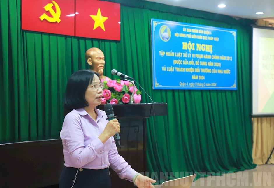 Đồng chí Nguyễn Thị Kim Liên phân tích nội dung trọng tâm của các văn bản luật(Thanhuytphcm.vn) - Sáng 9/5, UBND Quận 4 tổ chức Hội nghị tập huấn Luật Xử lý vi phạm hành chính năm 2012 (được sửa đổi, bổ sung năm 2020) và Luật Trách nhiệm bồi thường của Nhà nước năm 2017.