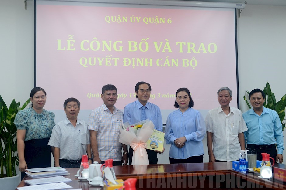 Lãnh đạo Quận 6 chúc mừng đồng chí Dương Quang Trí(Thanhuytphcm.vn) - Sáng 13/3, Quận 6 tổ chức lễ công bố và trao Quyết định cán bộ. Tham dự có các đồng chí: Ma Xuân Việt, Bí thư Quận ủy Quận 6; Lê Kim Hiếu, Phó Bí thư Thường trực Quận ủy Quận 6; Lê Thị Thanh Thảo, Phó Bí thư Quận ủy, Chủ tịch UBND Quận 6; cùng các Ủy viên Ban Thường vụ Quận ủy Quận 6.