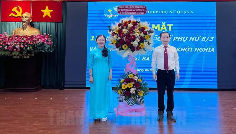 Bí thư Quận ủy Quận 6 Ma Xuân Việt trao hoa chúc mừng Hội LHPN Quận 6 tại buổi họp mặt.(Thanhuytphcm.vn) - Sáng 6/3, Hội LHPN Quận 6 tổ chức chương trình họp mặt kỷ niệm 114 năm Ngày Quốc tế Phụ nữ (8/3/1910 – 8/3/2024) và 1984 năm cuộc khởi nghĩa Hai Bà Trưng.