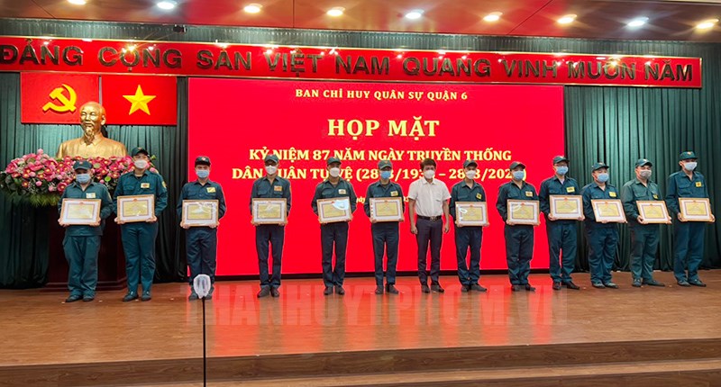 Dịp này, Ban Chỉ huy Quân sự Quận 6 trao Giấy khen cho 12 cá nhân trong thực hiện huấn luyện nâng cao tại thành phố và 6 tập thể đạt giải trong hội thao chào mừng 87 năm Ngày truyền thống Lực lượng Dân quân tự vệ (28/3/1935 - 28/3/2022).