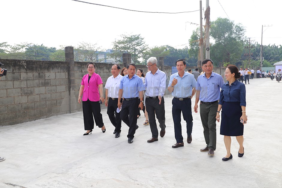 Các đồng chí lãnh đạo tham quan hẻm 1135 sau khi đã được nâng cấp, mở rộng(Thanhuytphcm.vn) - Sáng 25/4, Quận ủy, UBND, Ủy ban MTTQ Việt Nam Quận 7 tổ chức mừng công, thông xe kỹ thuật công trình nâng cấp, mở rộng hẻm 1135 Huỳnh Tấn Phát, phường Phú Thuận và khởi công công trình nâng cấp, mở rộng hẻm 803 Huỳnh Tấn Phát, phường Phú Thuận.