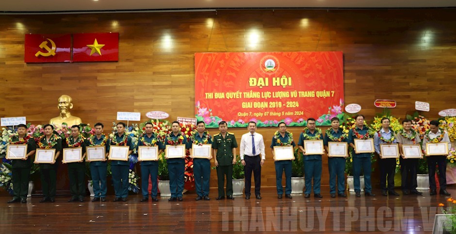 Các đồng chí lãnh đạo trao giấy khen cho các tập thể điển hình tiêu biểu trong phong trào thi đua quyết thắng lực lượng vũ trang quận giai đoạn 2019 - 2024(Thanhuytphcm.vn) - Sáng 7/5, Quận 7 đã tổ chức Đại hội thi đua quyết thắng lực lượng vũ trang quận giai đoạn 2019 – 2024. Đến tham dự có các đồng chí: Thiếu tướng Phan Văn Xựng, Chính ủy Bộ Tư lệnh TPHCM; Võ Khắc Thái, Bí thư Quận ủy; Hoàng Minh Tuấn Anh, Chủ tịch UBND quận; Nguyễn Dũng Hùng, Chủ tịch Ủy ban MTTQ Việt Nam quận; Trung tá Huỳnh Trung Hiếu, Chỉ huy trưởng Ban CHQS quận.