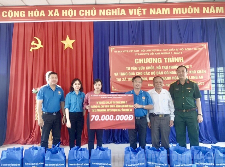 Phó Chủ tịch Ủy ban MTTQ Việt Nam Quận 8 Dương Tấn Lộc trao tặng bảng tượng trưng 100 phần quà tổng trị giá 70 triệu đồng cho hộ dân có hoàn cảnh khó khăn(Thanhuytphcm.vn) - Ngày 10/3, Ủy ban MTTQ Việt Nam Quận 8 phối hợp cùng Hội Liên hiệp Thanh niên Việt Nam - Ban Chỉ huy Quân sự Quận 8 tổ chức chương trình Tháng 3 biên giới năm 2023 tại xã Thuận Bình, huyện Thạnh Hóa, tỉnh Long An.