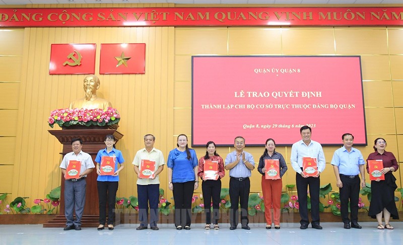 Tại hội nghị, đồng chí Võ Ngọc Quốc Thuận, Thành ủy viên, Bí thư Quận ủy và đồng chí Đỗ Hữu Trí, Phó Bí thư Thường trực Quận ủy đã trao quyết định giải thể Đảng bộ cơ quan Đảng, đoàn thể; Đảng bộ cơ quan chính quyền kể từ ngày 29/6/2023; giải thể Đảng bộ Doanh nghiệp từ ngày 14/7/2023 và công bố các quyết định thành lập, chỉ định Bí thư, Phó Bí thư, Chi ủy viên của 24 chi bộ trực thuộc Đảng bộ Quận 8 gồm: