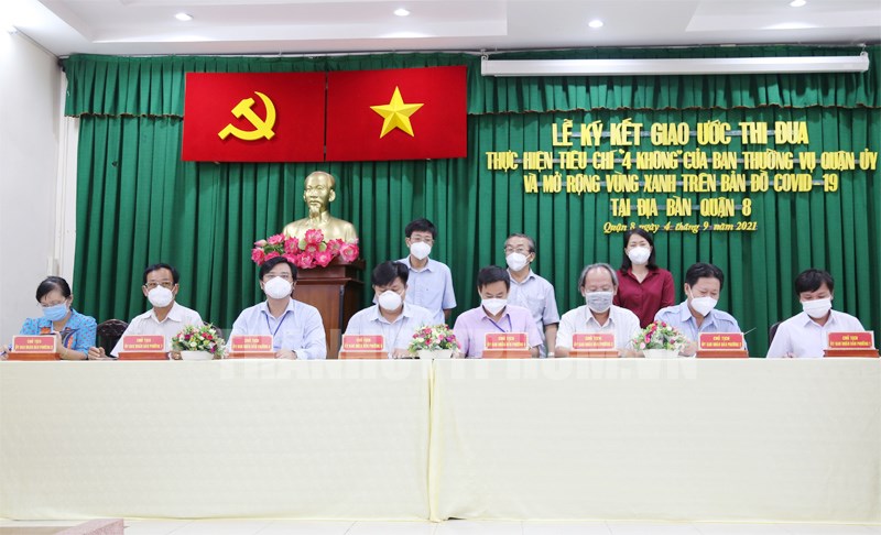 (Thanhuytphcm.vn) - Chiều 4/9, Quận 8 tổ chức lễ ký kết giao ước thi đua thực hiện tiêu chí “4 không” của Ban Thường vụ Quận ủy Quận 8 về tăng cường các biện pháp phòng, chống dịch và mở rộng vùng xanh trên bản đồ Covid-19 trên địa bàn từ nay đến ngày 15/9/2021 (ảnh).