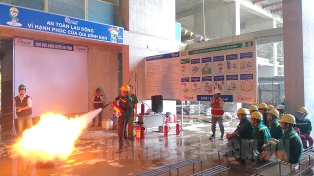 Cán bộ, công nhân viên trực tiếp làm việc tại Công trình xây dựng Chung cư Phương Việt, đường Tạ Quang Bửu, Phường 6, Quận 8 thực hành phòng cháy chữa cháy
