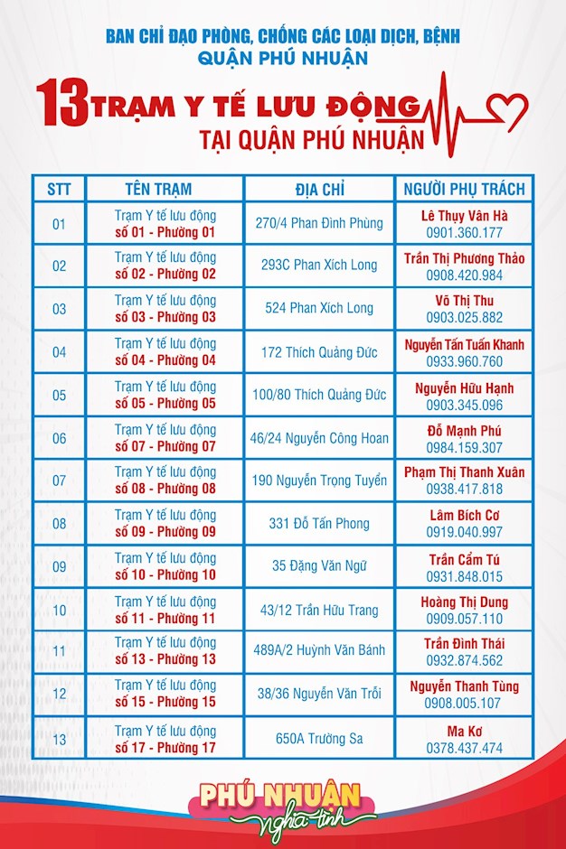 Danh sách Trạm Y tế lưu động 13 phường(Thanhuytphcm.vn) - Từ ngày 25 - 27/8, quận Phú Nhuận đã lần lượt thành lập và chính thức đưa vào hoạt động trạm y tế lưu động tại 13 phường trên địa bàn quận.