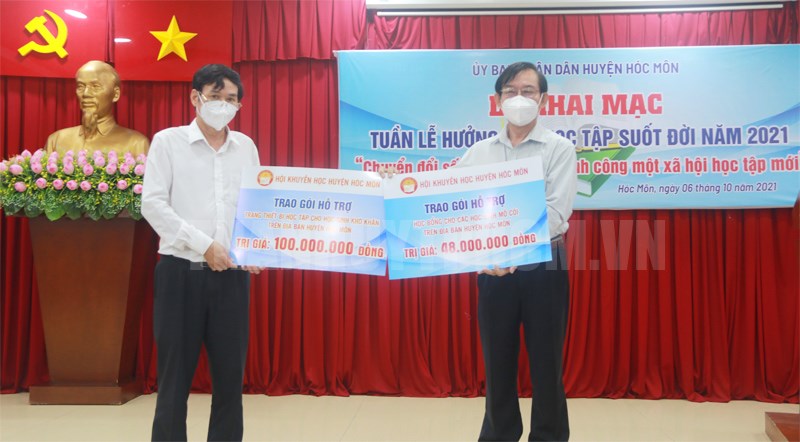 Hưởng ứng “Tuần lễ học tập suốt đời năm 2021”, Chủ tịch Hội khuyến học huyện Hóc Môn Đỗ Trung Tín cho biết: Nhằm kịp thời hỗ trợ các em học sinh khó khăn, Hội khuyến học huyện trích Quỹ khuyến học huyện số tiền 148 triệu đồng để trao tặng các gói hỗ trợ, trong đó: Gói hỗ trợ 100 triệu đồng để trang bị phương tiện học tập cho học sinh tham gia học trực tuyến; Gói 48 triệu đồng để hỗ trợ cho 48 em học sinh mồ côi do bị ảnh hưởng dịch Covid-19. Hội khuyến học huyện tiếp tục hỗ trợ, đồng hành cùng các em học sinh giỏi có hoàn cảnh khó khăn.