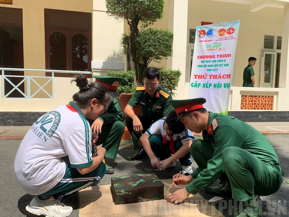 Thanh thiếu nhi quận cũng được đồng chí Võ Trung Nghĩa, Bí thư Chi đoàn Kho K99, Cục Kỹ thuật Binh chủng Thông tin Liên lạc tuyên truyền về lịch sử Quân đội Nhân dân Việt Nam và lịch sử hình thành và phát triển Kho K99, Cục Kỹ thuật Binh chủng Thông tin Liên lạc. Bên cạnh đó, các em được thực hiện các hoạt động quân đội như: tập các bài thể dục, 8 thế tấn võ trong quân đội, trải nghiệm gấp xếp nội vụ, thử thách điều lệnh đội ngũ, thử thách tăng gia sản xuất và thử thách rèn luyện thể lực quân nhân. Ngoài ra, trong chương trình các bạn đoàn viên, thanh thiếu nhi cùng các chiến sĩ Chi đoàn Kho K99 đã tổ chức chương trình giao lưu văn nghệ với các tiết mục ca ngợi Tổ quốc, Bác Hồ, quê hương đất nước và Quân đội Nhân dân Việt Nam.