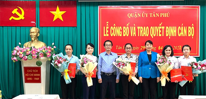 Bí thư Quận ủy Lê Thị Kim Hồng, Phó Bí thư Quận ủy, Chủ tịch UBND quận Phạm Minh Mẫn trao quyết định và hoa chúc mừng 5 đồng chí.(Thanhuytphcm.vn) - Chiều 29/4, Quận ủy, UBND quận Tân Phú tổ chức lễ trao quyết định cán bộ. Tham dự có: Bí thư Quận ủy Lê Thị Kim Hồng; Phó Bí thư Quận ủy, Chủ tịch UBND quận Phạm Minh Mẫn.