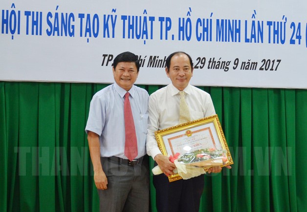 Phó Chủ tịch UBND TPHCM Huỳnh Cách Mạng trao giải Nhất tại Hội thi Sáng tạo kỹ thuật TPHCM lần thứ 24 cho PGS.TS.BS Tăng Chí Thượng. (Ảnh: Đan Như)