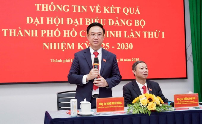 Trưa 15/10, Thành ủy TPHCM tổ chức họp báo thông tin kết quả Đại hội đại biểu Đảng bộ TPHCM lần thứ I, nhiệm kỳ 2025-2030. Các đồng chí: Đặng Minh Thông, Phó Bí thư Thành ủy TPHCM; Dương Anh Đức, Ủy viên Ban Thường vụ Thành ủy, Trưởng Ban Tuyên giáo và Dân vận Thành ủy TPHCM, chủ trì họp báo. Tại buổi họp báo, nhiều vấn đề liên quan đến Đại hội, trong đó có liên quan đến việc cụ thể hóa các chỉ đạo của Tổng Bí thư Tô Lâm giải quyết các vấn đề dân sinh được phóng viên các báo, đài đặt ra.