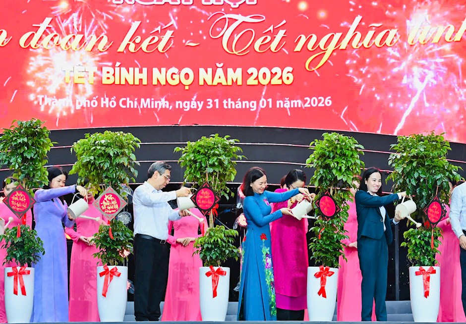 Đại biểu thực hiện nghi thức khai mạc Ngày hội "Xuân đoàn kết - Tết nghĩa tình" và chương trình "Siêu thị mini 0 đồng - Tết Bính Ngọ 2026". Ảnh: VIỆT DŨNGNgày 31-1, tại Công viên Văn hóa Đầm Sen (phường Bình Thới, TPHCM), Ủy ban MTTQ Việt Nam TPHCM tổ chức khai mạc Ngày hội “Xuân đoàn kết - Tết nghĩa tình” và khai mạc "Siêu thị mini 0 đồng - Tết Bính Ngọ 2026".