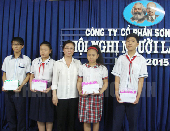 Bà Nguyễn Thị Nhung, Tổng Giám đốc Công ty Sơn Á Đông (người thứ 3 từ trái qua) trao tặng học bổng cho con em công nhân.