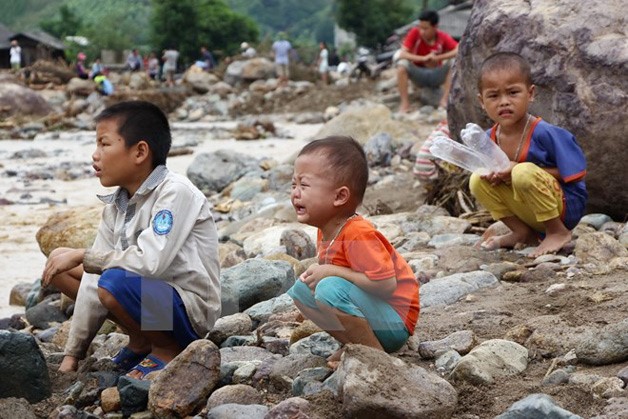 Trẻ em bản Huổi Liếng, xã Năm Păm buồn bã, thẫn thờ sau mưa lũ. (Ảnh: TTXVN)Đến chiều 4/8, các lực lượng cứu hộ đã tiếp cận được các bản bị cô lập của xã Nặm Păm là bản Huổi Hốc và bản Pá Piệng.