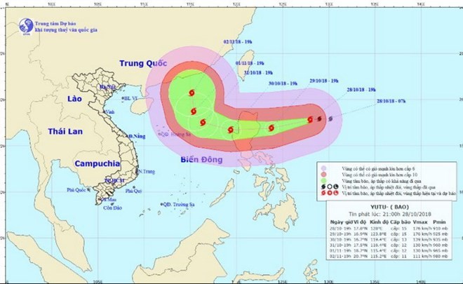 Chùm ảnh đường đi và vị trí cơn bão. (Nguồn: nchmf.gov)Theo thông tin từ Trung tâm Dự báo Khí tượng Thủy văn Quốc gia, đến 19 giờ ngày 28/10, vị trí tâm bão Yutu ở vào khoảng 17,8 độ Vĩ Bắc; 128,0 độ Kinh Đông, cách đảo Luzon của Philippines khoảng 600km về phía Đông. Sức gió mạnh nhất vùng gần tâm bão từ cấp 16 (185-200 km/h) giảm xuống cấp 15 (165-185 km/giờ), giật trên cấp 17.