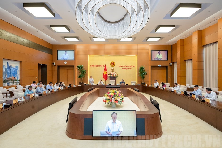 Toàn cảnh phiên họp sáng 24/8(Thanhuytphcm.vn) - Sáng 24/8, tại Nhà Quốc hội, tiếp tục chương trình phiên họp thứ 25, Ủy ban Thường vụ Quốc hội (UBTVQH) cho ý kiến về việc giải trình, tiếp thu, chỉnh lý dự án Luật Viễn thông (sửa đổi).