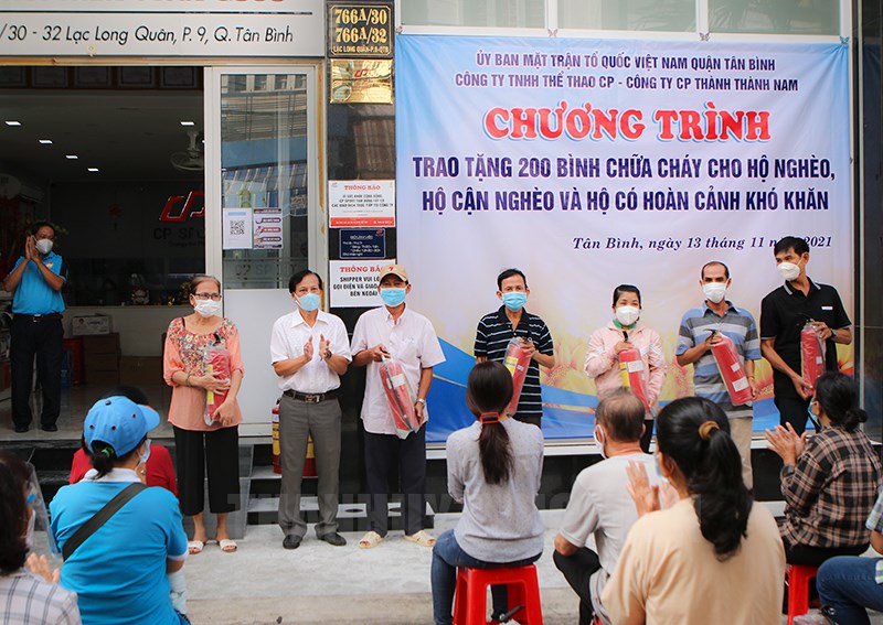 Phó Chủ tịch Ủy ban MTTQ Việt Nam quận Huỳnh Văn Bé trao tặng bình chữ cháy cho các hộ.(Thanhuytphcm.vn) - Sáng 13/11, Ủy ban MTTQ Việt Nam quận Tân Bình phối hợp với Công ty TNHH Thể thao CP và Công ty cổ phần Thành Thành Nam đã trao tặng 200 bình chữa cháy cho hộ nghèo, hộ cận nghèo, hộ có hoàn cảnh khó khăn trên địa bàn quận.
