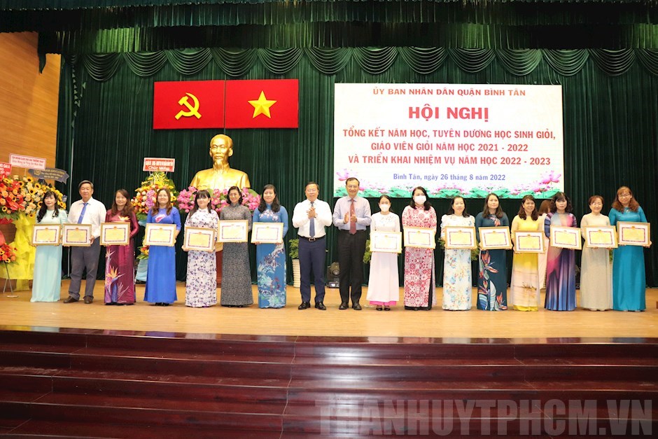 Đồng chí Lê Hoài Nam và đồng chí Huỳnh Khắc Điệp trao giấy khen cho các cá nhân được tuyên dương tại hội nghị(Thanhuytphcm.vn) - Sáng 26/8, UBND quận Bình Tân tổ chức hội nghị tổng kết năm học, tuyên dương học sinh giỏi, giáo viên giỏi năm học 2021-2022 và triển khai nhiệm vụ năm học 2022-2023.