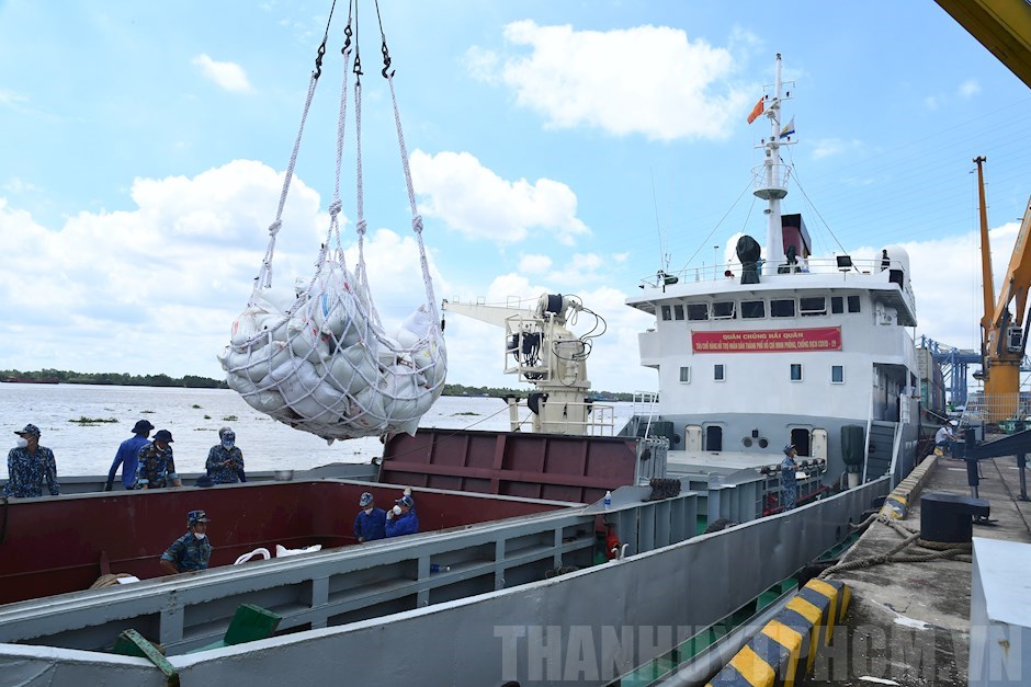 Ngay sau khi tàu cập cảng, các ô tô vận tải của Vùng 2 Hải quân bố trí sẵn và được cán bộ, chiến sĩ Lữ đoàn 125 Hải quân tổ chức bốc xếp lên xe để vận chuyển đến các khu vực hỗ trợ người dân chống dịch. Theo kế hoạch, Vùng 2 Hải quân sẽ vận chuyển 260 tấn gạo đến 30 điểm hỗ trợ các quận huyện của TPHCM và các tỉnh Đồng Nai, Bình Dương.