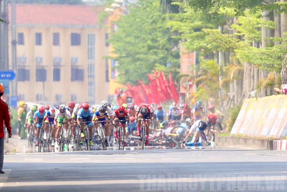 Tuy nhiên, khi đoàn đua đang trong tầm rút, một sự cố không may xảy ra khiến hàng loạt tay đua té ngã cách đích khoảng 300m. Trong nhóm té ngã có cả áo vàng Igor Frolov (TPHCM Vinama), áo xanh Nguyễn Tấn Hoài (Tập đoàn Lộc Trời), áo trắng Nguyễn Văn Bình (TPHCM New Group)… Đang rút tốc độ cao nên vụ va chạm khá mạnh, khiến nhiều tay đua bị xây xát, rất may không có trường hợp nghiêm trọng. Đa số các tay đua bị nạn sau đó đã có thể cố gắng về đích. Tai nạn xảy ra gần vạch đích nên các tay đua gặp sự cố được tính kết quả đồng giờ với đoàn đông.