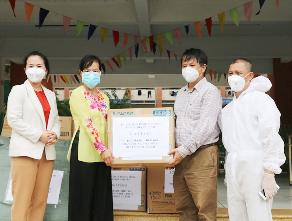 Đoàn công tác tặng quà Khu chăm sóc, theo dõi và điều trị F0 tại cụm trường học Tân Túc, thị trấn Tân Túc, huyện Bình ChánhThay mặt các đơn vị báo chí, các nhà thảo tâm, đồng chí Trần Trọng Dũng, Chủ tịch Hội Nhà báo TP cho biết, thông qua đợt quyên góp vật dụng, trang thiết bị y tế của Hội đến nay đã vận động được gần 900 triệu đồng để cung cấp đến 6 bệnh viện dã chiến điều trị Covid-19. Riêng quà tặng hôm nay là các vật tư, trang thiết bị y tế, vật dụng, nhu yếu phẩm, trong đó có 3.000 khẩu trang y tế N95, 450 bộ bảo hộ y tế tặng Khu chăm sóc, theo dõi và điều trị F0 tại cụm trường Tân Túc, huyện Bình Chánh.